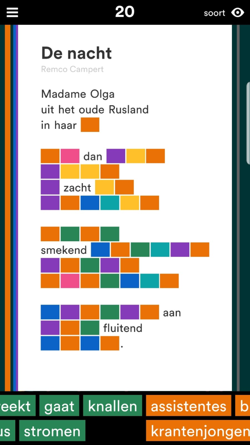 Ik verdiep me in vakbladen, websites, kranten en social media. Enkele voorbeelden zijn: leraar24.nl, kennisnet.nl, examenblad.nl, dvhn.nl, lezenvoordelijst.nl, de pagina leraar Nederlands op FB en het blad Lezen. Met name ligt mijn interesse op het gebied van Nederlands en dan vooral de noviteiten op het gebied van ICT. Zo kwam ik via het blad Lezen op een app als Puzzling Poetry (lln. leren spelenderwijs hoe poëzie in elkaar steekt) afb. 2.