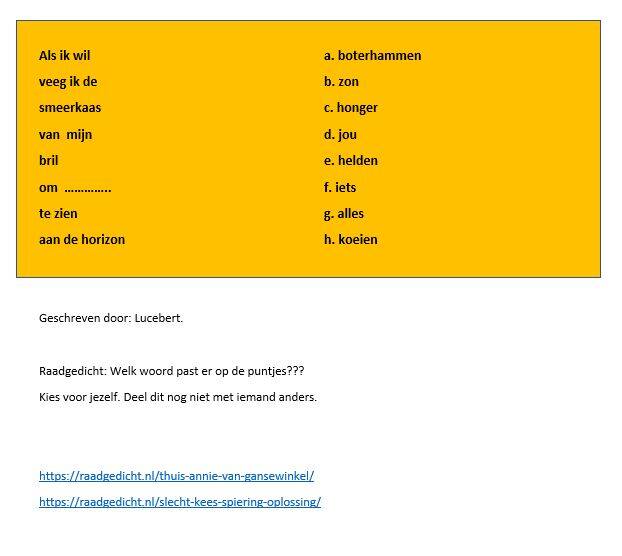 Op dinsdag volg ik colleges bij de NHL. Bij Didactiek van de Jeugdliteratuur kregen we tijdens de les de site raadgedicht.nl als tip. Je geeft de klas een gedicht via het digibord. Er is een woord weggelaten. Welke zou het zijn? Dit zijn waardevolle momenten die meteen praktisch toepasbaar zijn. Deze les heb ik meteen de volgende dag al uitgeprobeerd. Zie de foto hiernaast.