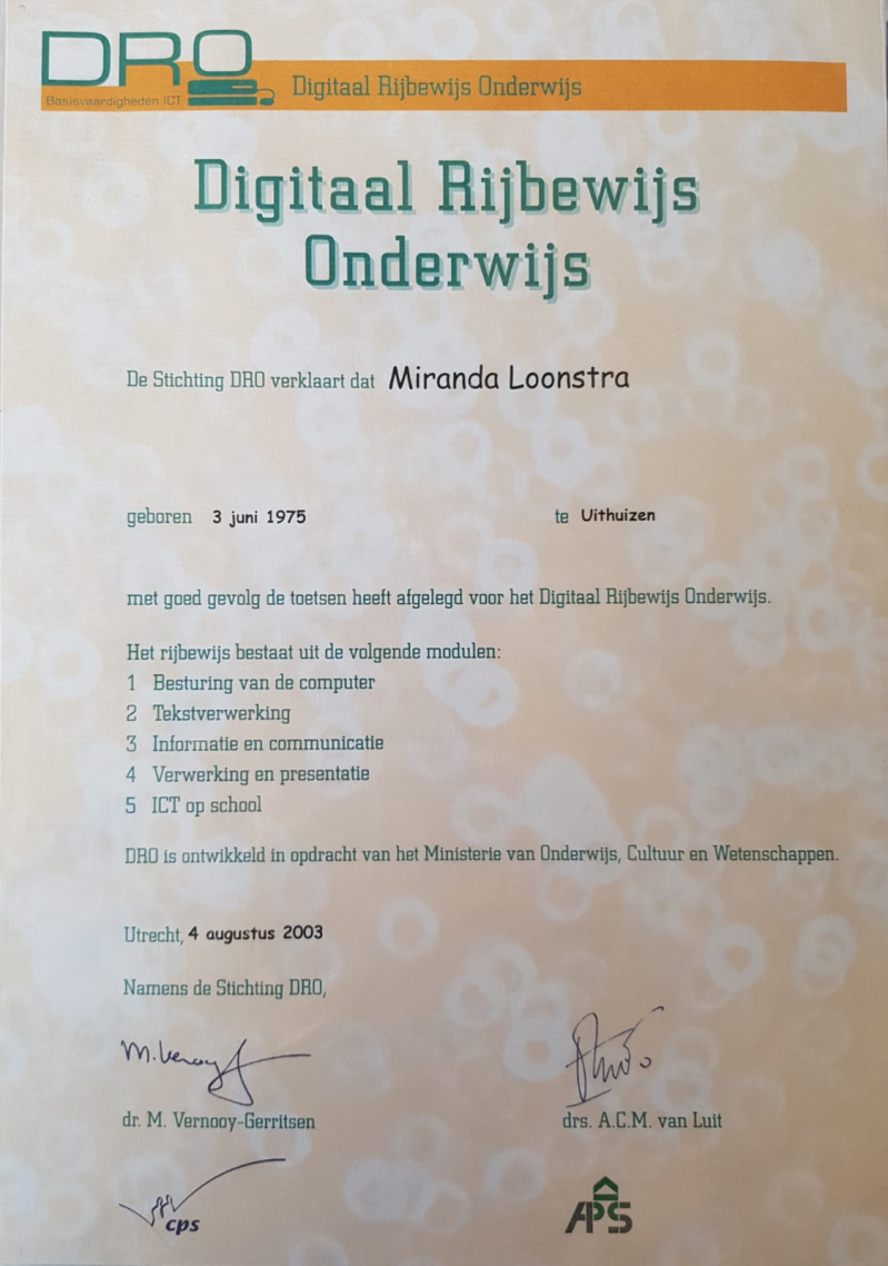 Als leerkracht moest je 3 modules volgen. Als ICT-er moest je 5 modules volgen en examen doen. Zie het certificaat hiernaast.